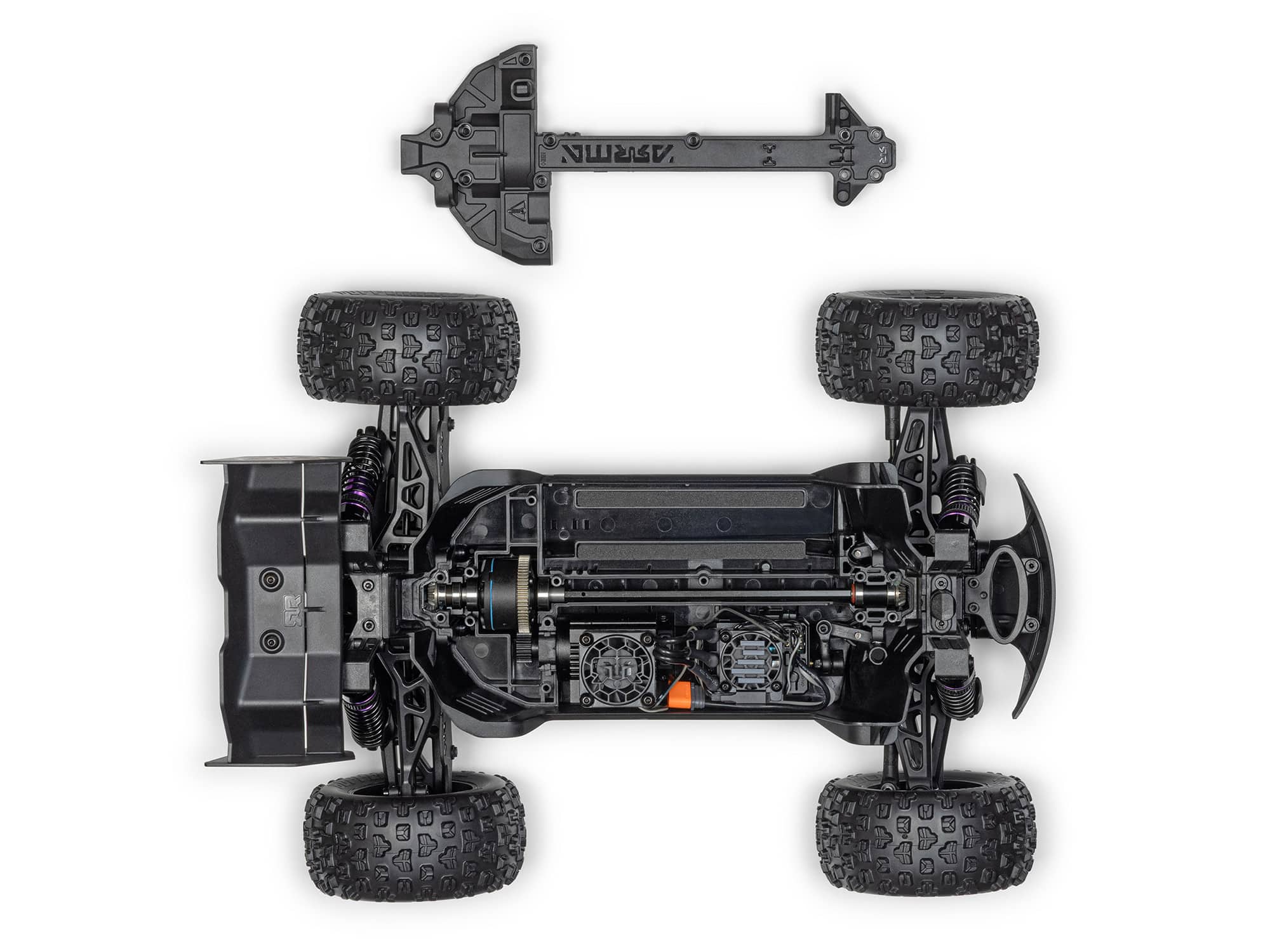 The MINI KRATON 3S BLX 4X4 monster truck body snaps onto the chassis easily, quickly, and securely, and comes off with a simple press-and-release. With no tiny clips to force into place, it’s a body attachment system that’s perfect even for young bashers.