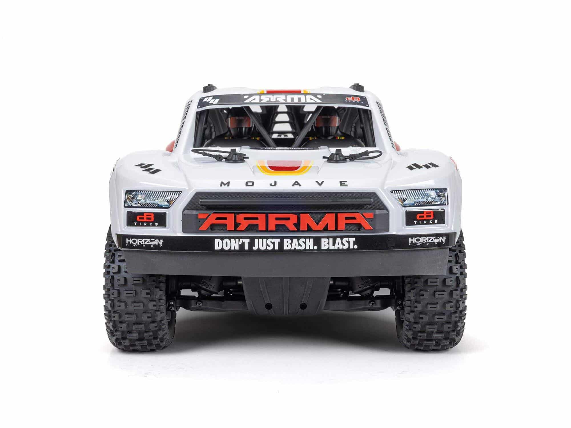 Go brushless bashing in a big way with the affordable ARRMA® MOJAVE™ 4S BLX 4X4 Desert Truck RTR. It’s got it all – legendary toughness, dynamic handling, and the brutal speed of a Spektrum™ 4S-ready brushless power system that’s capable of 50+ mph under optimum conditions. Even better, this high-performance package comes wrapped in exciting 1/8 scale desert truck realism, complete with a detailed cockpit plus a roll cage and roof rails!