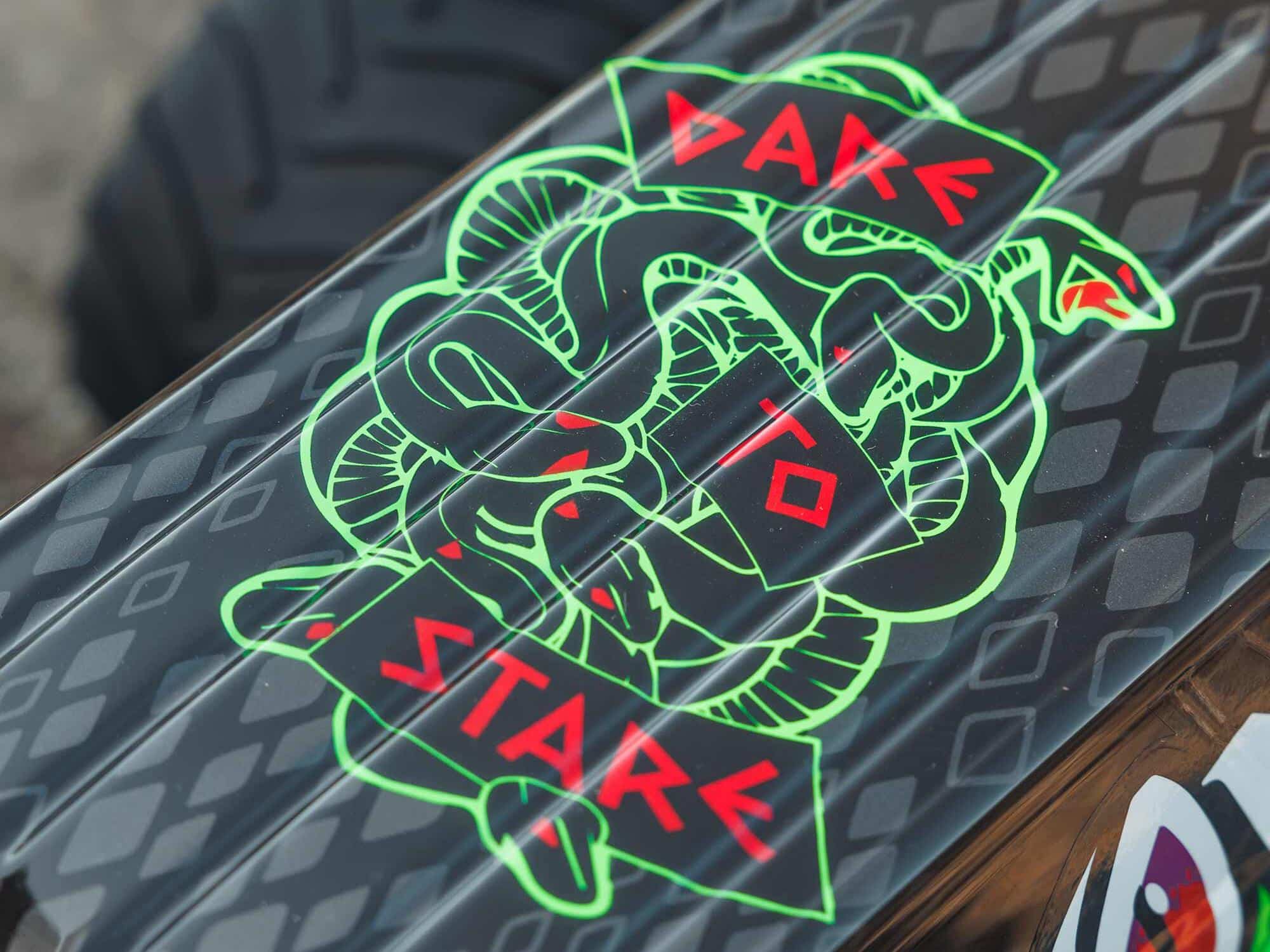 No options are needed for the GORGON MT to make you the centre of attention from the start. Straight out of the box, its strikingly original looks draw a crowd. The body comes factory-finished in your choice of red or fluorescent yellow, with colour-coordinated shock springs, battery tray, skid plates, and front and rear bumpers that resist impacts and help protect those “fang-tastic” graphics.