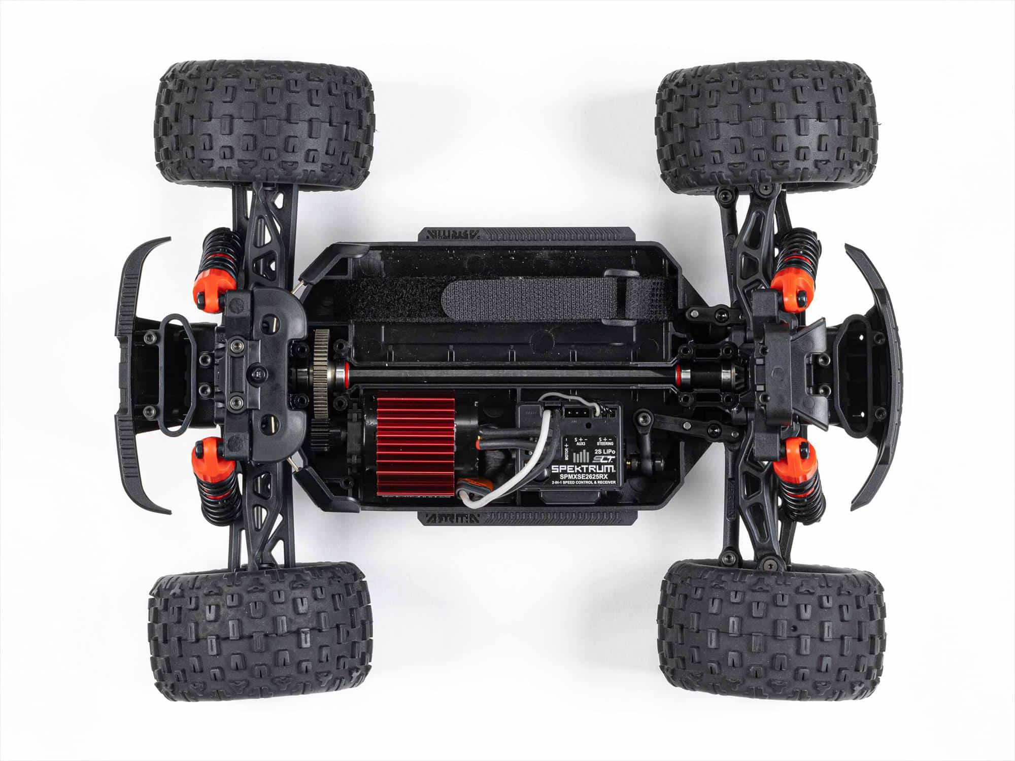 The high-quality Spektrum SLT2 2-channel transmitter is the perfect size for all drivers. It can help you learn control skills safely by limiting the monster truck’s maximum speed to 50% or 75% until you’re ready for it all. Four AA batteries included.