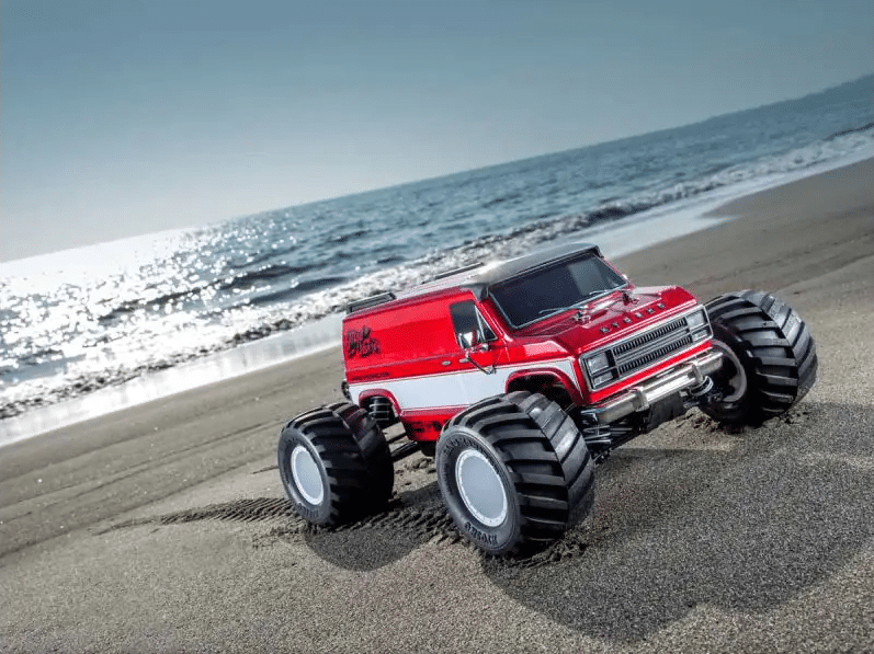 Polycarbonate body is painted bright red and white. Separate molded parts such as the bumper, grille and side mirrors enhance the scale feel of this 1970’s & 80’s American van motif. A roof guard is also installed. Extra decal sheet included to customize body.