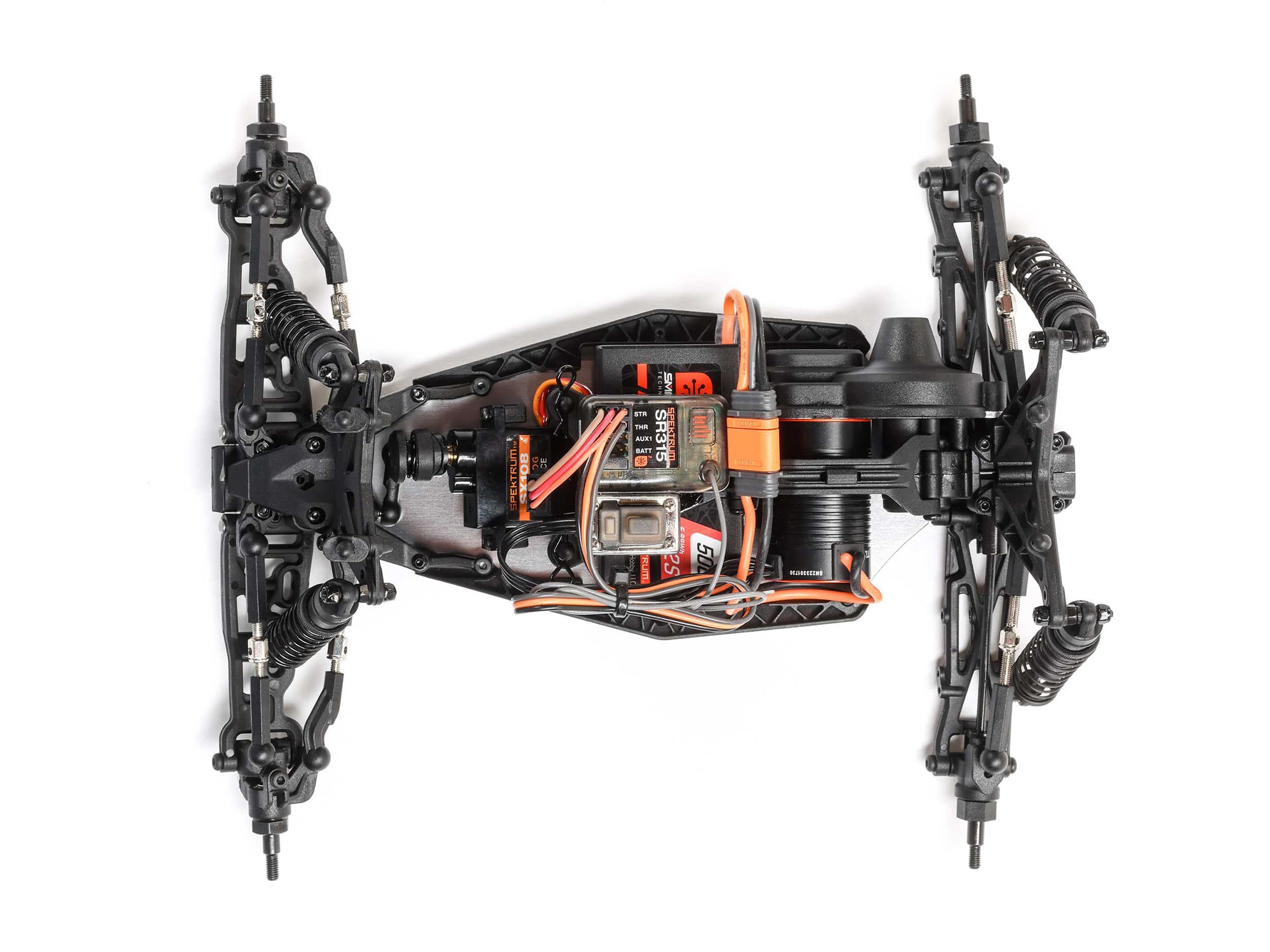 Straight out of the box, the Losi Mini-T 2.0 2WD Brushless Stadium Truck is completely assembled and ready-to-run. The efficient 2-in-1 brushless motor and ESC system can get around the track at 30 mph speeds, and the suspension is inspired by the prestigious TLR® 22 – a vehicle often seen on the podium at competitive 1/10 scale buggy races. The combination of high power with predictable handling enables the Mini-T 2.0 to perform like a high-end machine, agile in the corners and easy to jump, with plenty of durability to survive crashes and continue to the finish.
