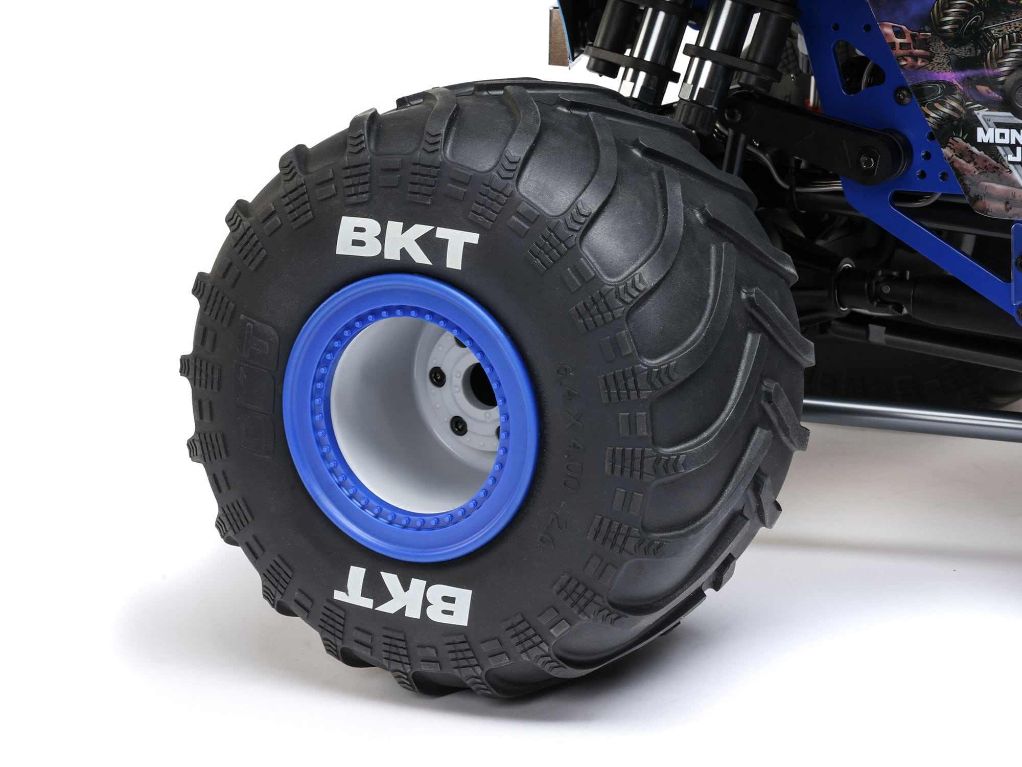 With wider offset 2.6″ wheels and slightly taller tyres, the Losi LMT 2.0 appears much more dominating and scale than its predecessor. The faux beadlocks can be removed or painted to give your monster truck a custom look. Along with accurate sidewall and logo details, the officially licensed BKT tyres have a more scale and less aggressive chevron tread pattern that improves handling on a wide range of surfaces – from groomed dirt or carpet monster truck tracks to driveways, yards, and local parks.