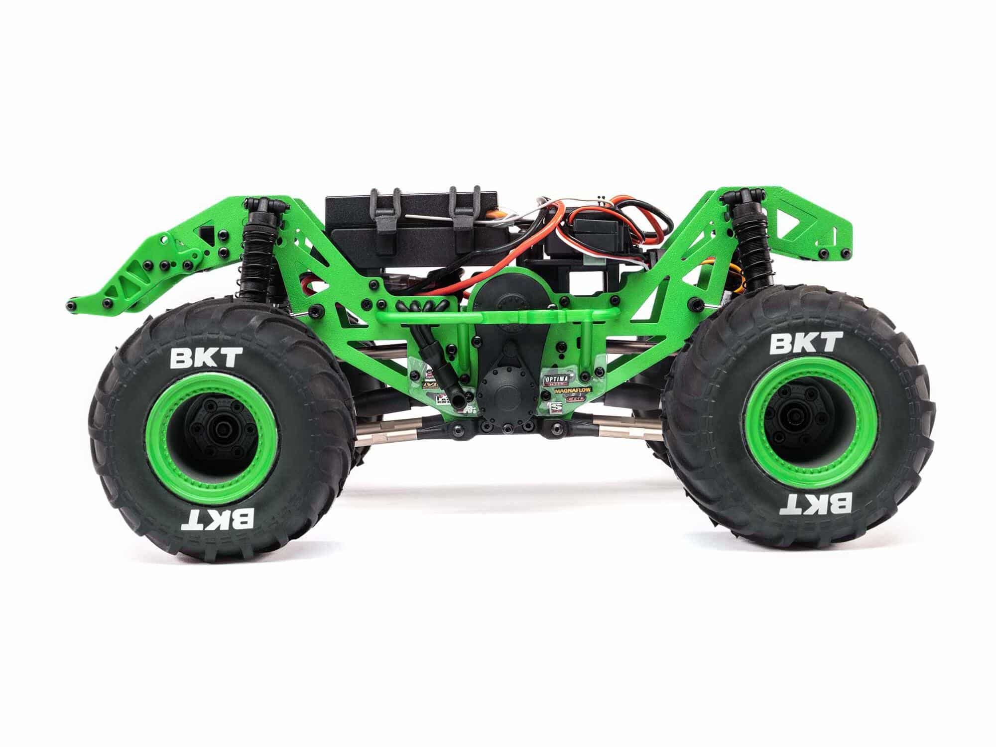 BKT are the tyres that pro drivers use at Monster Jam competitions around the world, and they’ve been officially licensed for reproduction on the Mini LMT 4WD. The tyres feature a Chevron tread design that provides excellent traction. The smooth sidewall transition keeps the tyres from grabbing and causing rollovers.