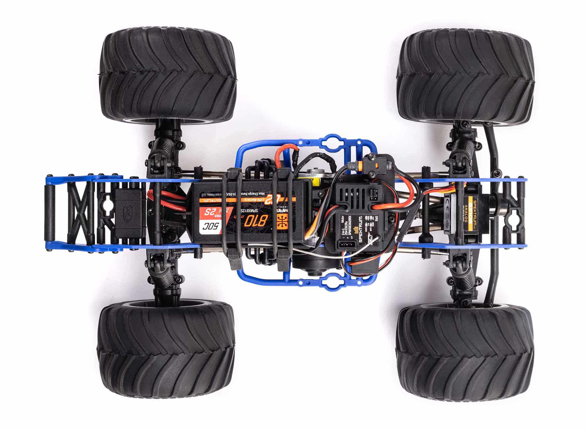 Losi Mini LMT 4WD monster truck comes factory-built and finished, with everything required for operation in the box – including a high-quality Spektrum SLT2 radio for interference-free 2.4GHz control, and a high-capacity Spektrum Smart LiPo battery and charger for long run times and effortless recharging.