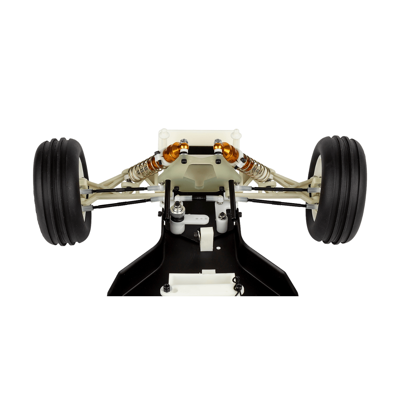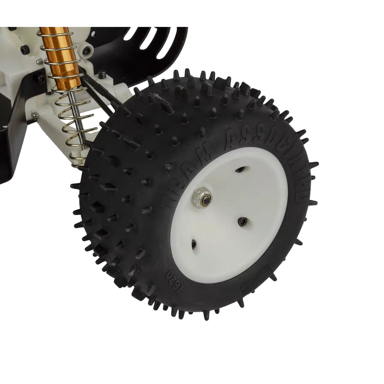 Truck racing wheels and tires were also developed specially for the RC10T. This rerelease RC10T comes with standard wide rear tires and the famously banned narrow front tires. All wheels are lightweight, 3-piece modular design, molded perfectly concentric in virgin nylon. The narrow front tires were designed for the existing ROAR Truck Class rules of the era and used on the winning prototype RC10Ts.
