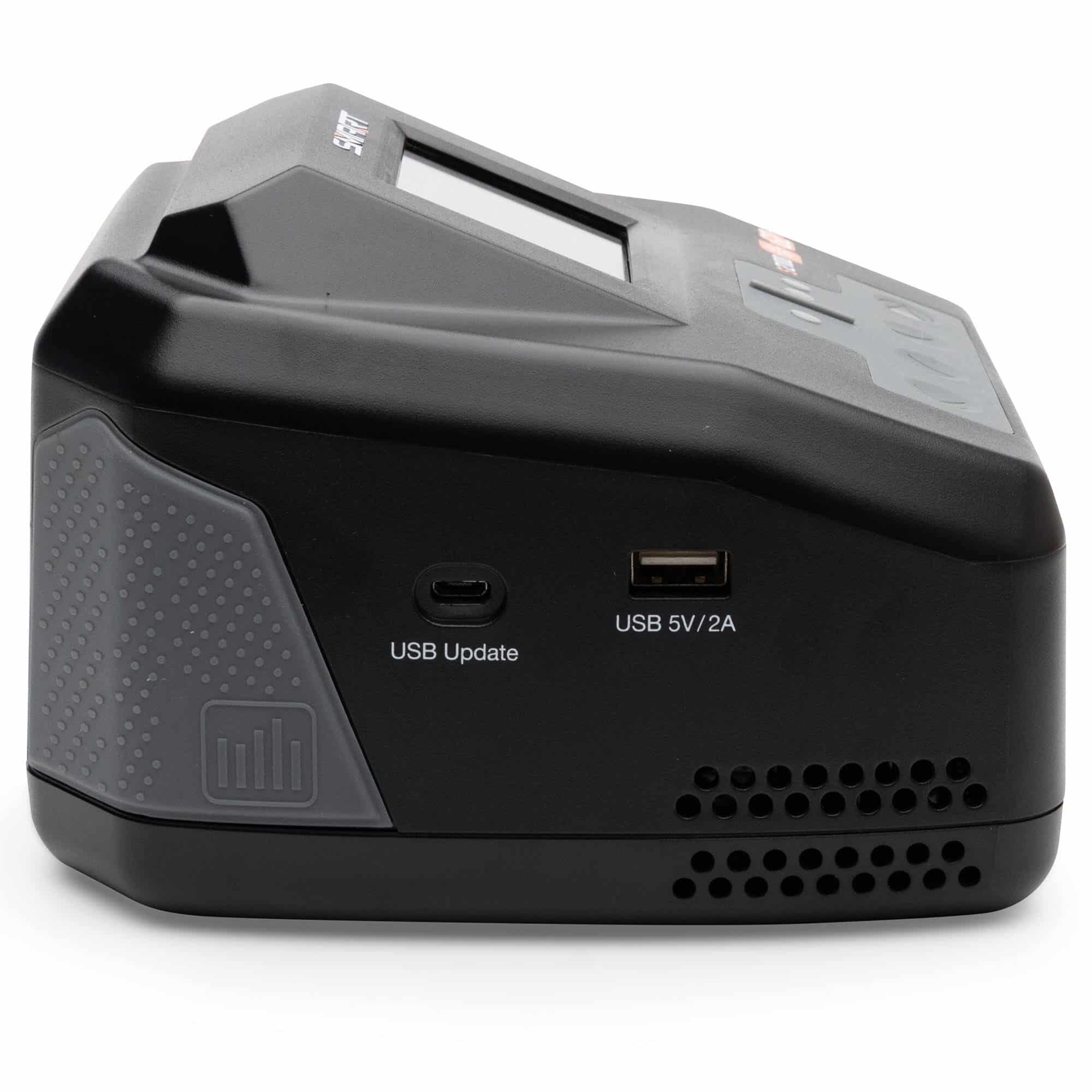 The charger’s sleek case fits perfectly on your workbench and in your pit or field bag. Its power cord is detachable for easy transport. Rubber grips help you hold the charger securely while connecting and removing batteries. USB input and output ports enable you to update charger firmware and to charge secondary devices. Other features include a built-in ON/OFF power switch and low-noise cooling fan.