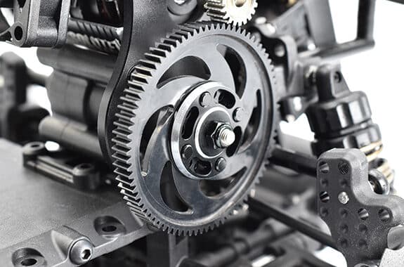 The spur gear is sandwiched between a lightweight aluminum separate type holder with SE (Shining Edge) processing, and it uses a center lock method that secures it with a single aluminum nylon nut. The 4-point positioning method eliminates the need to worry about centering the spur gear, allowing for quick spur gear replacement set that will make the RDX run even better!