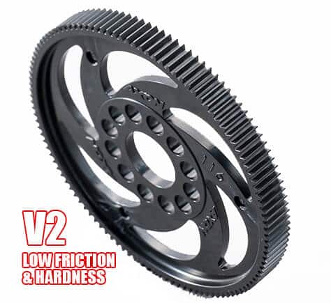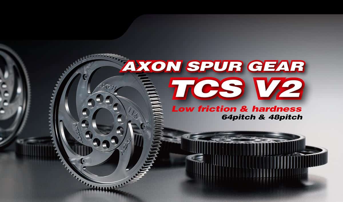 Axon have redesigned their popular TCS RC Spur gears and the V2 version is born. Tested over a long period of time in various different conditions, the new gear is more round and the tooth shape has been optimised. The result being a better feeling under throttle and braking as well as better rolling performance in cornering. Available in 64P, all versions from 100T to 116T and 48P only even numbers from 80T to 90T