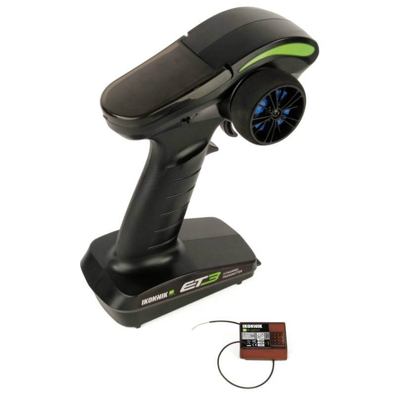 The IKONNIK ET3 is a user-friendly 2.4GHz radio system that offers three channel operation – two proportional channels for steering and throttle, and a handy switched third channel to control auxiliary functions or accessories. The transmitter fits the hand perfectly and with just four AA batteries it weighs very little, making it comfortable for longer races. Perfect for the newcomer and intermediate level drivers, the ET3 has many innovative features such as an internal antenna and a charging jack (for upgrading to rechargeable battery operation). As standard it includes end point adjustment on the throttle channel, a PPM output socket, steering dual rate and digital trim, plus servo reverse on steering and throttle. The protocol is IKONNIK Krypton, so it’s compatible with all other Helion vehicles that have Krypton inside. Supplied with a 3-channel all-weather IKONNIK Krypton receiver.