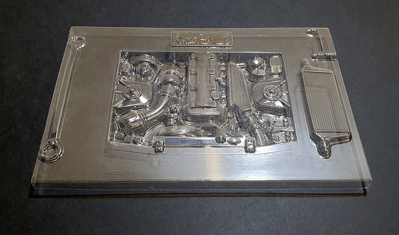 1/10th Scale vac formed engine bay in the 2JZ style. All engine bays come with an intercooler/radiator, oil cooler and strut brace added into the moulding.