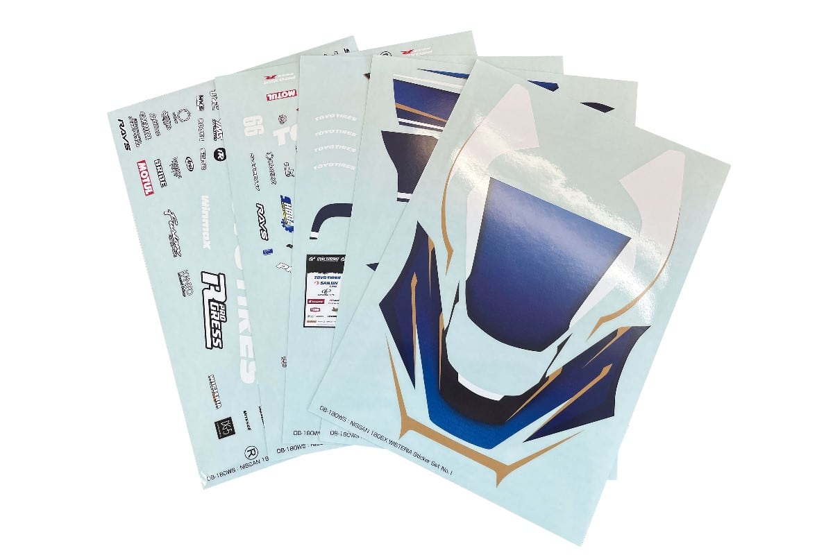 The sticker sets consist of a vinyl graphicsticker sheet (3 sheets) that faithfully reproduces the actual D1 vehicle and a sponsor logo sticker sheet (2 sheets), applied a sticker materi al that easily fits on curved body surfaces.