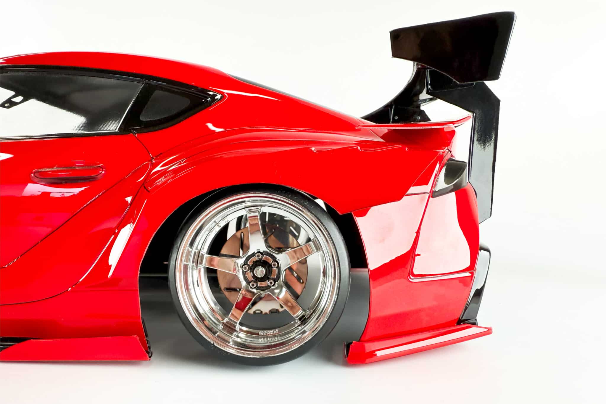 OreDa! Racing has refined the aero body designed by KUHL Racing to further improve its aerodynamic performance and powerful appearance, and has recreated the GR Supra driven by Mao Yamanaka in the D1GP as a 1/10 scale RC body. To realistically recreate the powerful wide and low form, the body, front bumper, and rear bumper are separated.