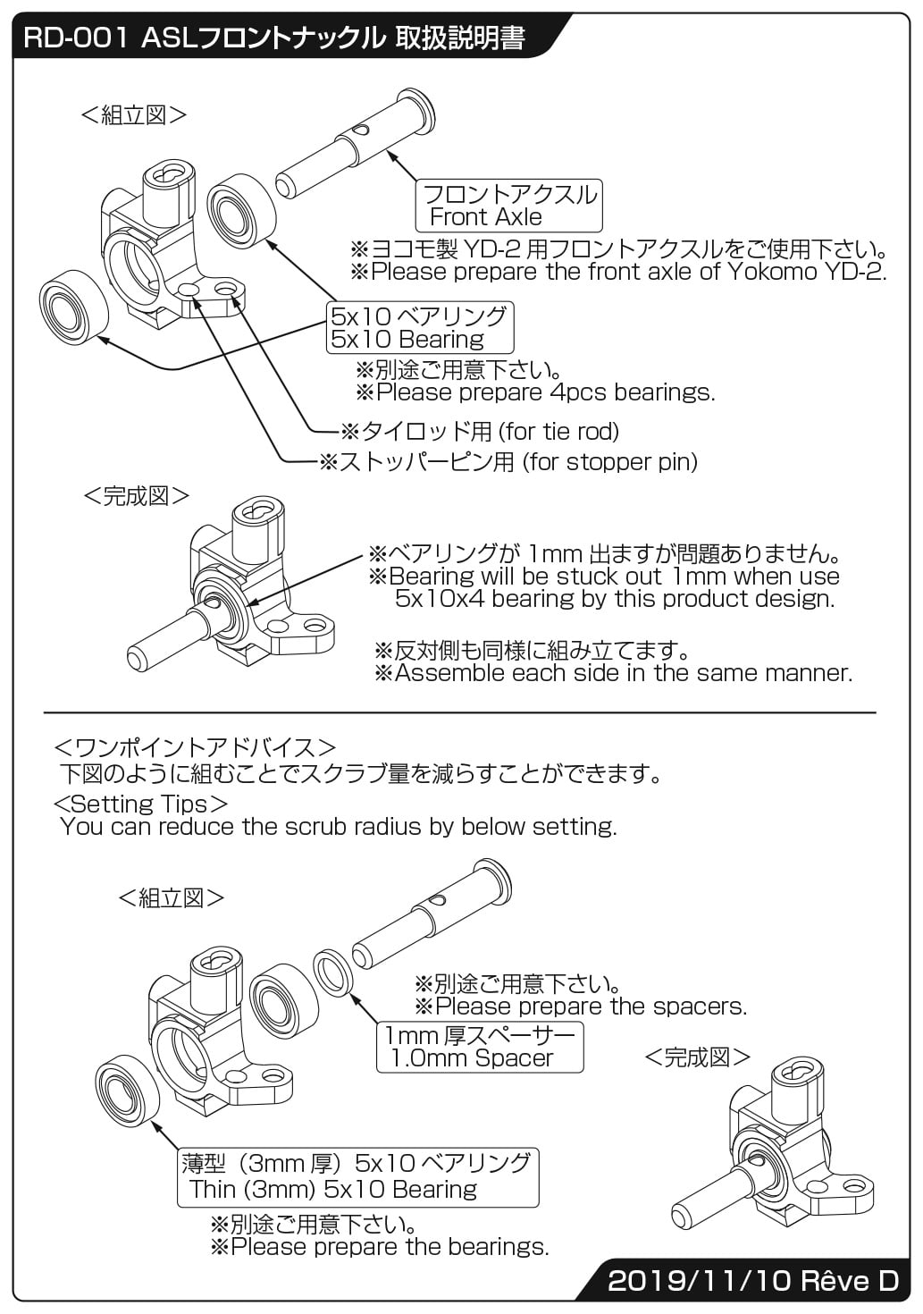 It is possible to use a normal size 10 x 5 bearing (4mm thick) as well as reduce the amount of scrub by using a thin (3mm thick) 10 x 5 bearing on the outside. (In that case, please use a 1.0mm thick spacer inside. Refer to the following instruction manual for details).