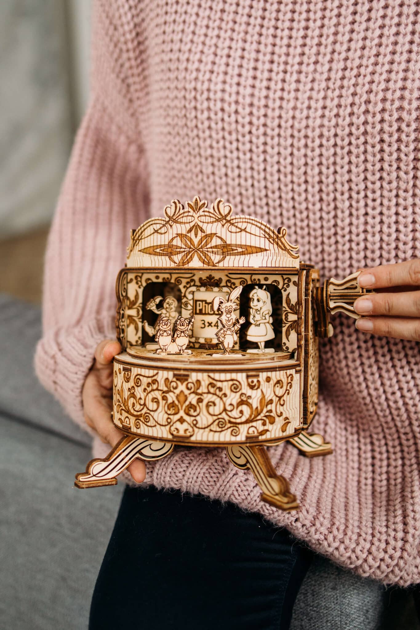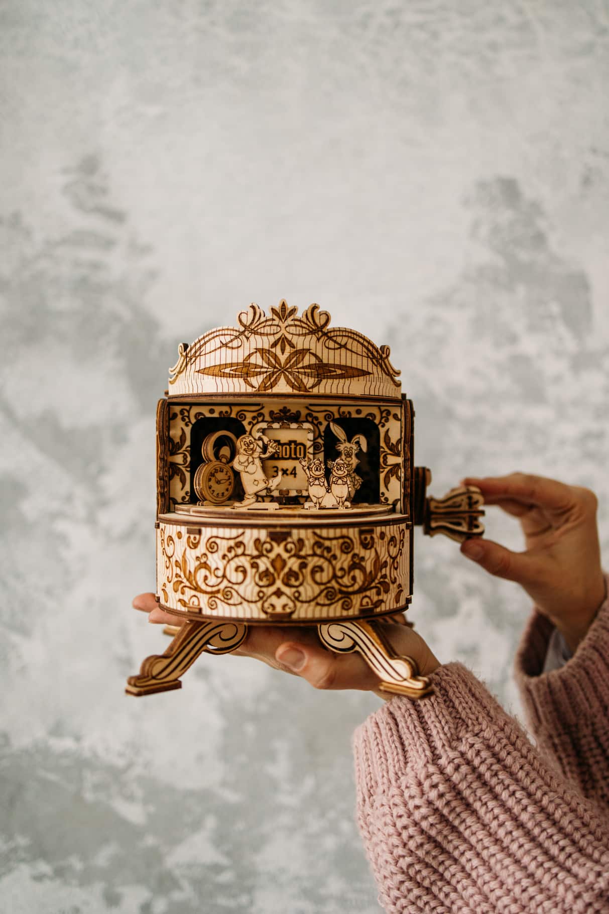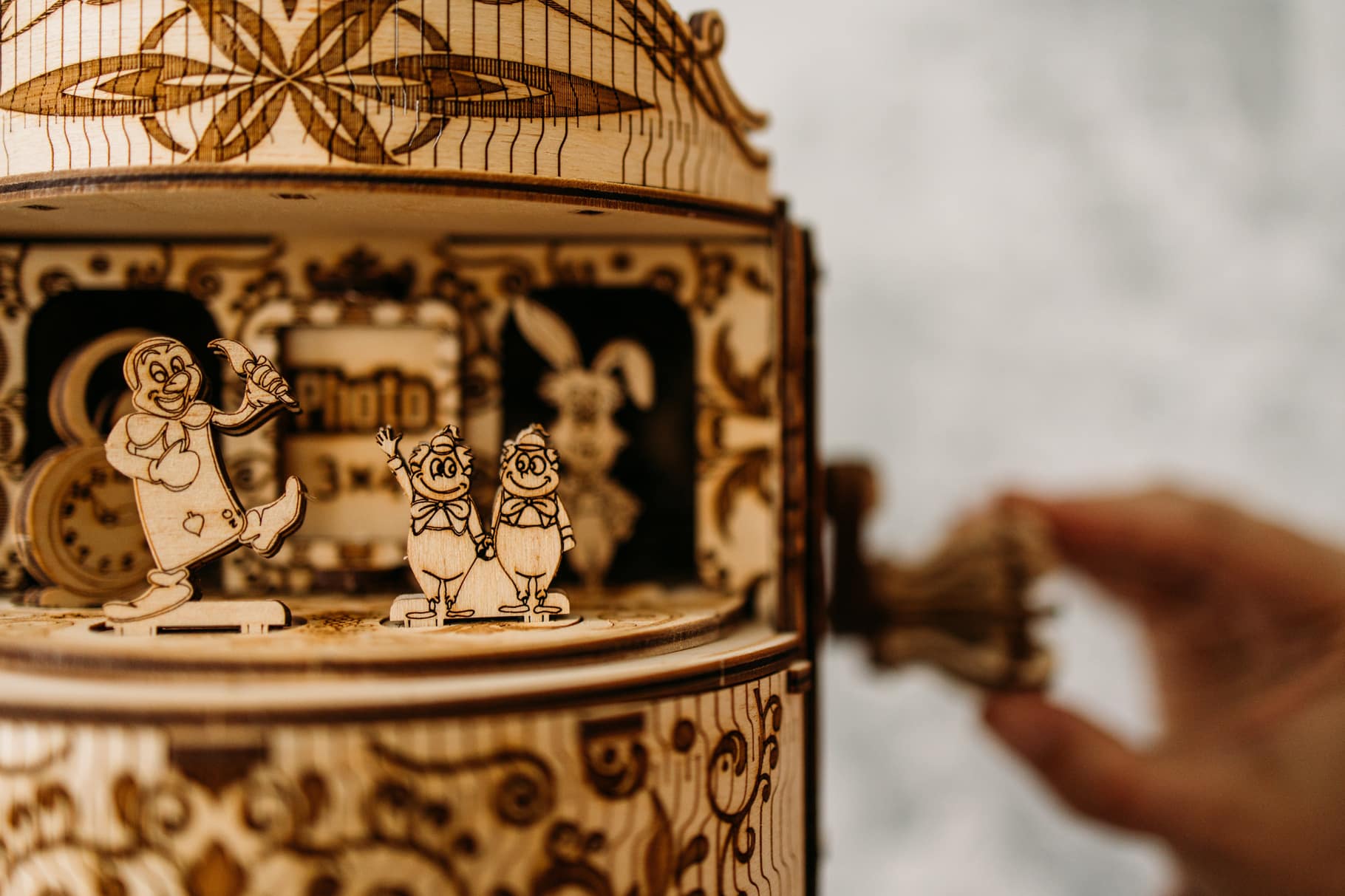 Lewis Carroll’s well-known novel “Alice’s Adventures in Wonderland” is about the fantastical setting where a little girl finds herself. Numerous cinematic versions of the story have focused on the fantastic exploits that are detailed in the book. Using the aesthetics of the 1951 Walt Disney Company cartoon with the concept of Alice in Wonderland, Wood Trick built their Fairy Theatre Music Box.