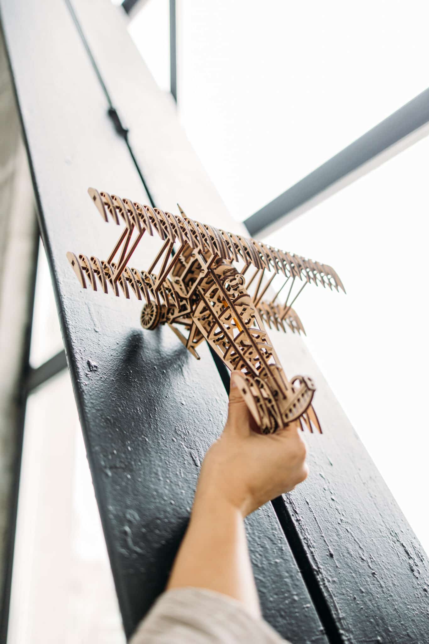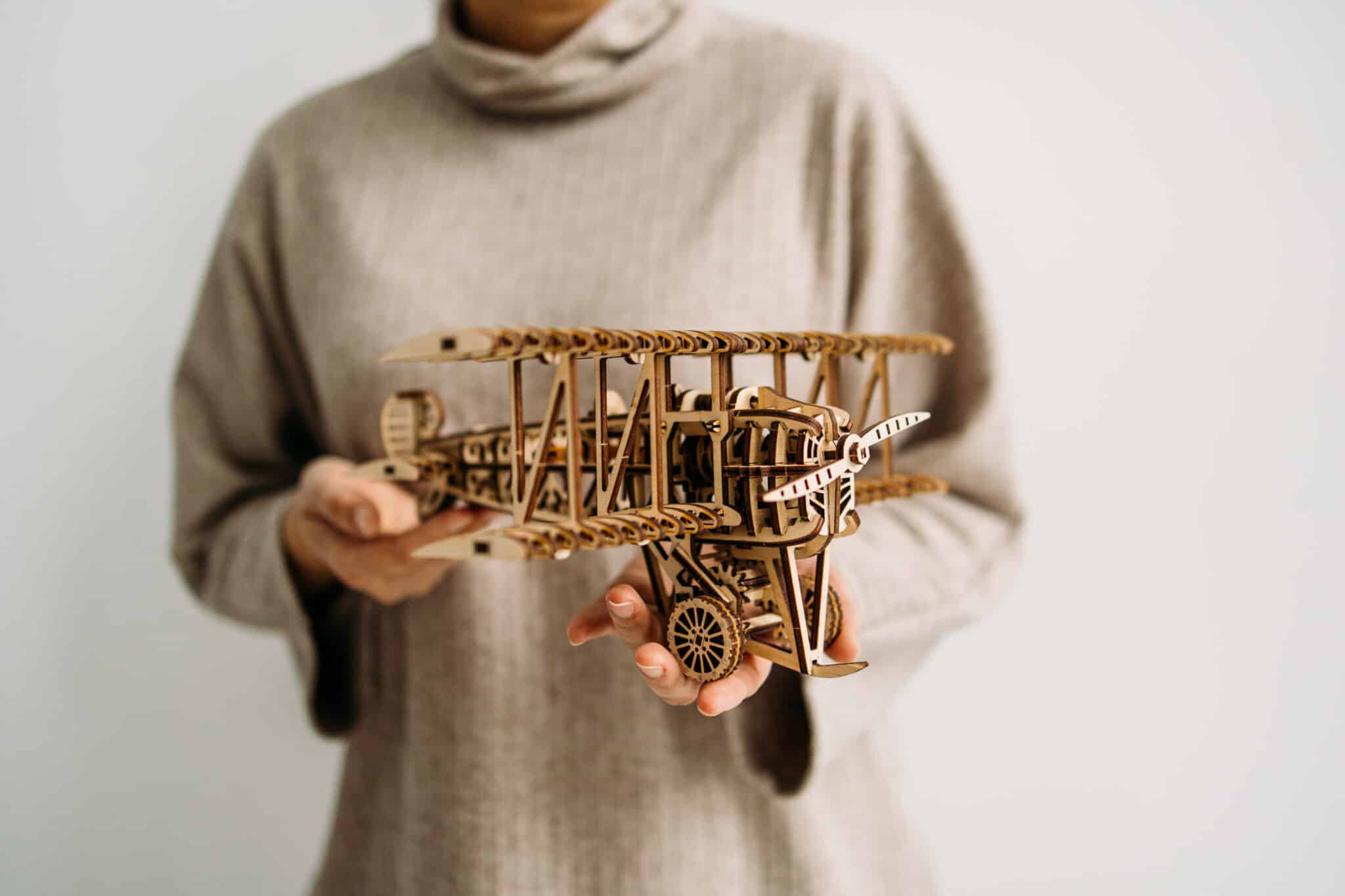 It is appropriate for everyone who enjoys the sky and aviation-related topics. Only eco-friendly materials are used to construct our prefabricated model airplane. The wooden model has 148 components in total. The assembly process requires no glue. The model set comes with comprehensive instructions to help you assemble the replica plane in about three hours. The model can be set in motion by spinning the propeller counterclockwise, choosing “Stop” on the handwheel, and turning the handwheel to the “Start” position. We implemented this interactive component on purpose to make our wooden model of the Plane an engaging game for its owner. A great gift for your family and friends is The Plane model. It will adorn your table, shelf, or nightstand and arouse fantasies of adventure, breathtaking scenery, and accomplishments!